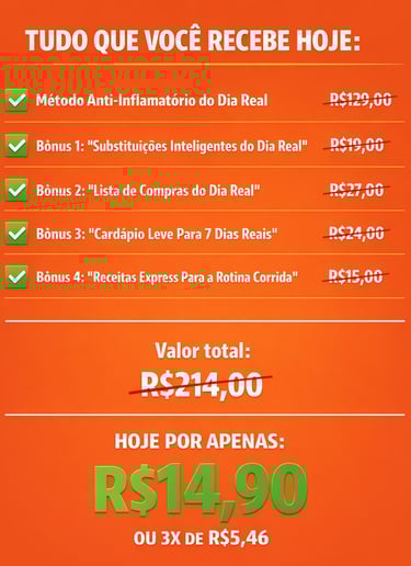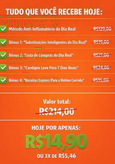 Com o Método Anti-Inflamatório do Dia Real, você tem em mãos uma forma mais simples de comer melhor, organizar sua rotina e começar uma mudança que realmente cabe na sua vida.